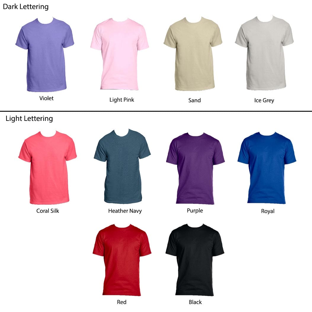 - NOTE: Light color shirts will have a graphic with Black lettering, dark shirts will have White lettering.